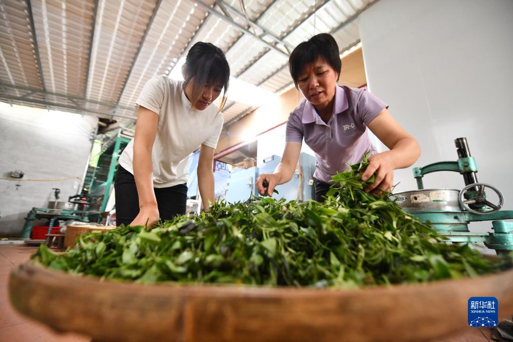 6月7日,在蒼梧縣六堡鎮山坪村,祝雪蘭(右)在制茶。