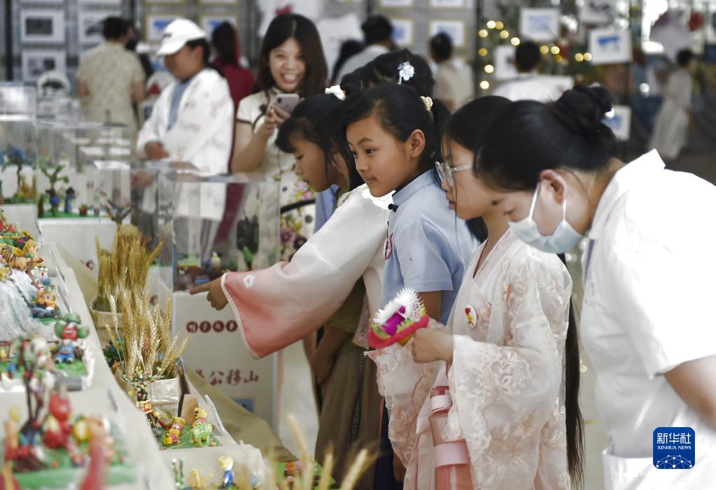 6月8日,學(xué)生們在活動(dòng)現場(chǎng)參觀(guān)展出的非遺作品。