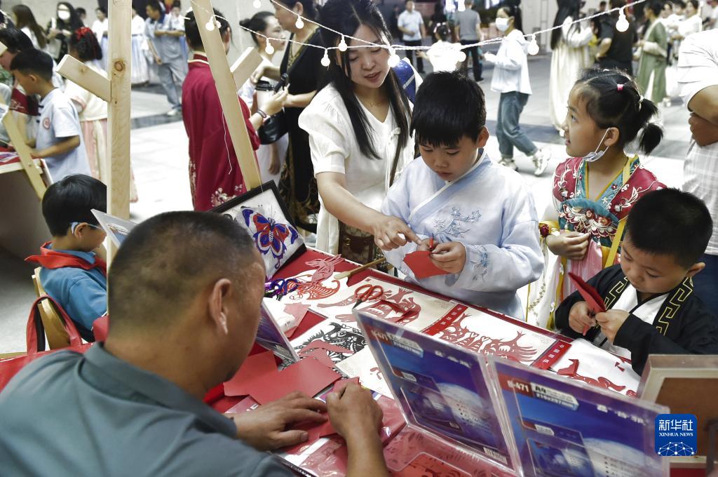 6月8日,學(xué)生們在活動(dòng)現場(chǎng)體驗剪紙技藝。