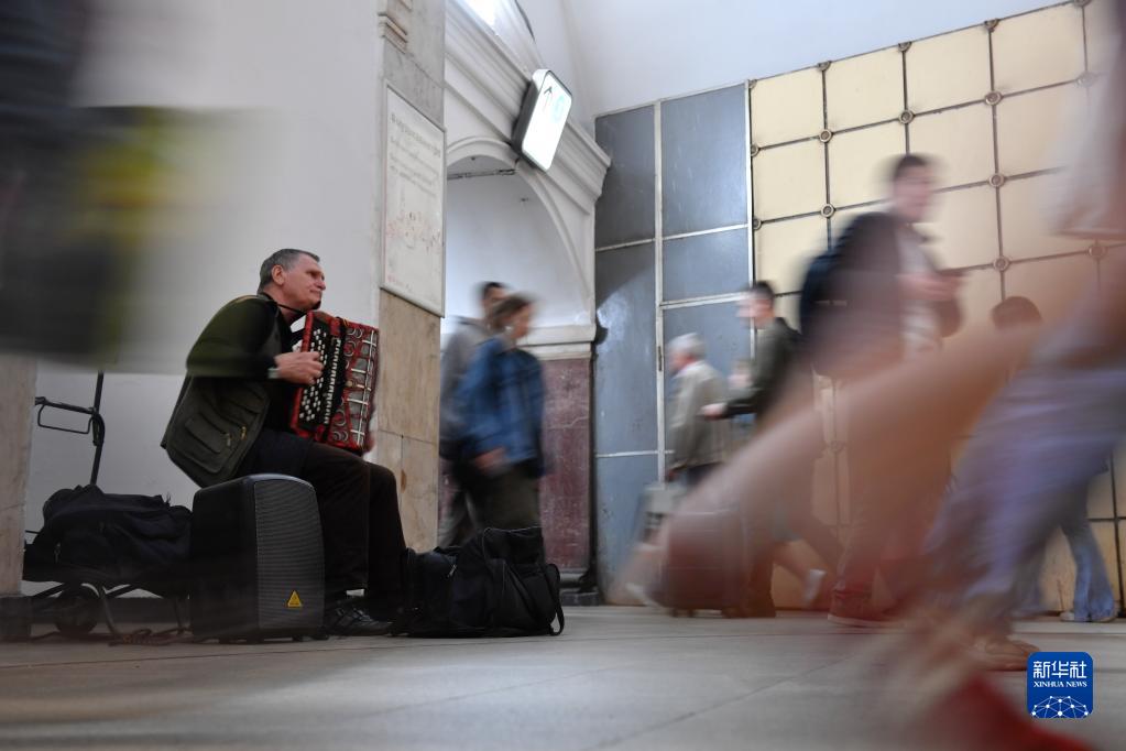 6月6日,在俄羅斯首都莫斯科,一名巴揚演奏家在地鐵站內表演。