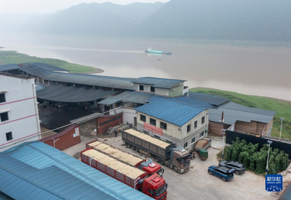 6月8日,在豐都藠頭出口龍頭企業(yè)重慶豐都明富實(shí)業(yè)有限公司的生產(chǎn)作業(yè)區,三輛滿(mǎn)載著(zhù)新鮮藠頭的貨車(chē)等待卸貨 (無(wú)人機照片) 。