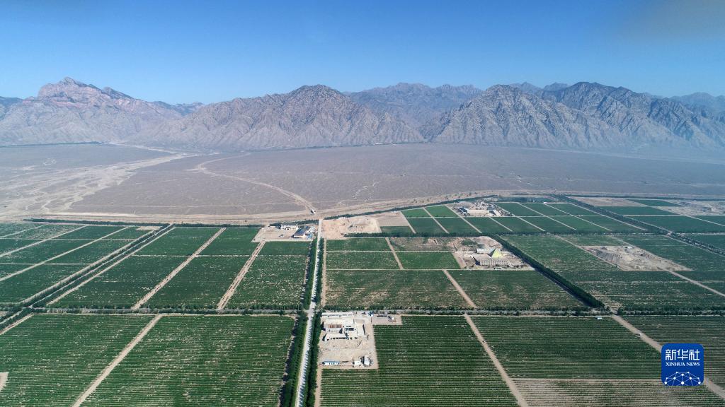 這是位于賀蘭山腳下的部分酒莊和釀酒葡萄種植基地(6月8日攝,無(wú)人機照片)。