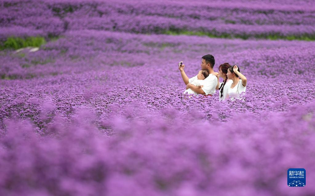 6月9日,游人在貴州省貴陽(yáng)市花溪區高坡苗族鄉石門(mén)村馬鞭草花海中游玩拍照。