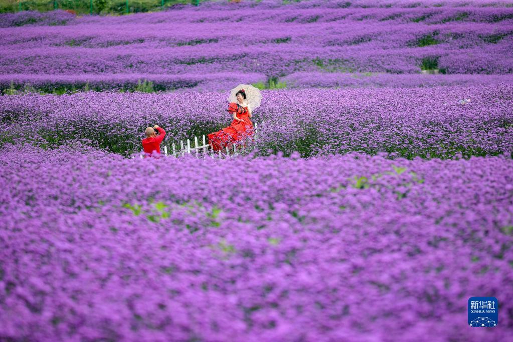 6月9日,游人在貴州省貴陽(yáng)市花溪區高坡苗族鄉石門(mén)村馬鞭草花海中游玩拍照。