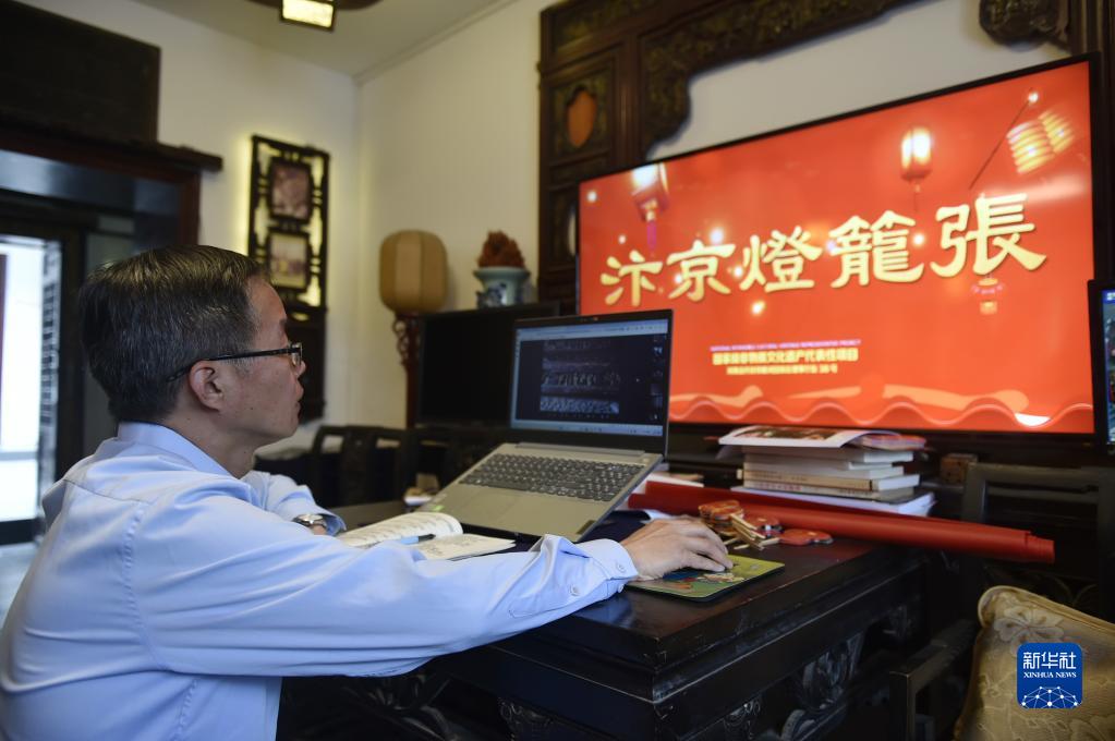6月7日,張俊濤在開(kāi)封市“汴京燈籠張”彩燈展覽館內整理電腦中的家用傳統木雕紋樣照片。