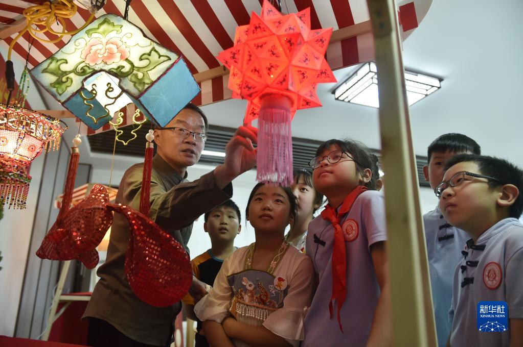 6月8日,張俊濤(左一)在鄭州經(jīng)濟技術(shù)開(kāi)發(fā)區列子小學(xué)參加非遺進(jìn)校園活動(dòng),向學(xué)生們介紹彩燈作品。