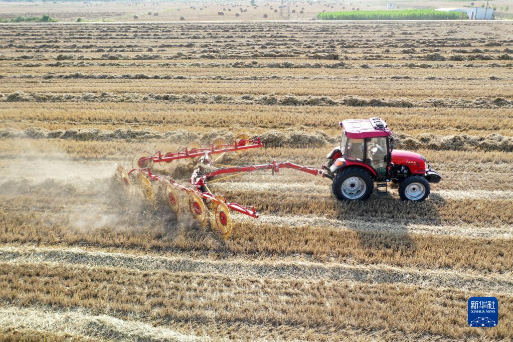6月8日,安徽省蒙城縣樂(lè )土鎮農民利用摟草機將小麥秸稈聚集在一起,準備進(jìn)行打捆收儲(無(wú)人機照片)。