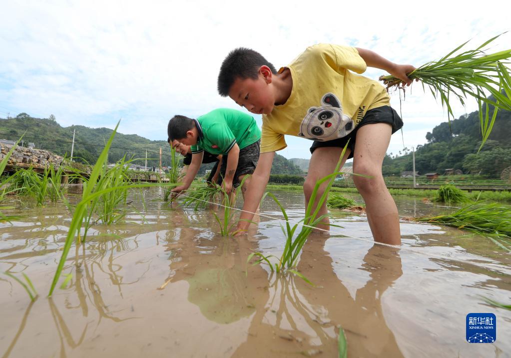 6月9日,學(xué)生在貴州省綏陽(yáng)縣中小學(xué)勞動(dòng)教育綜合實(shí)踐基地體驗插秧。