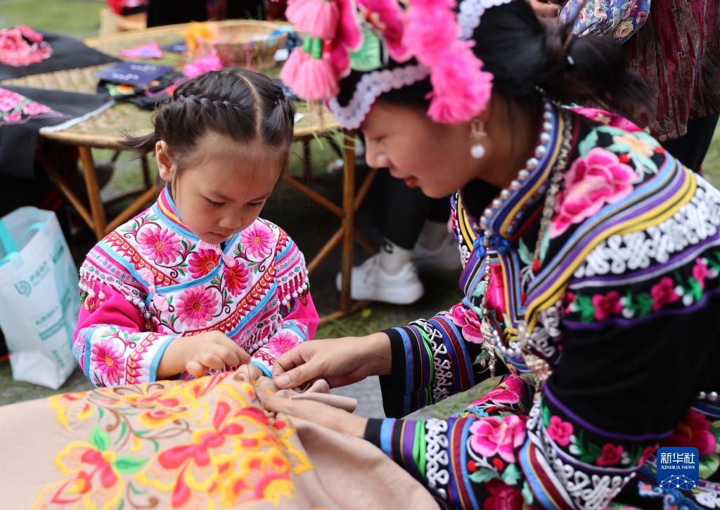 6月9日,繡娘在云南省楚雄市彝人古鎮活動(dòng)現場(chǎng)教小朋友刺繡。