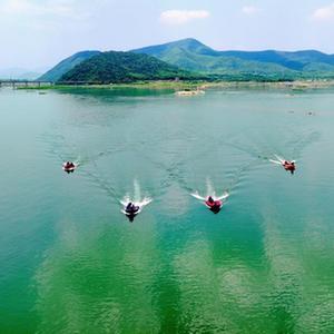 6月9日,在浙江省湖州市長(cháng)興縣合溪水庫煤山段,應急救援隊進(jìn)行沖鋒舟編隊演練(無(wú)人機照片)。
