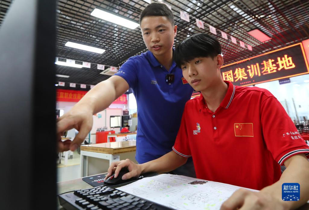 6月9日,在位于廣州的廣東省機械技師學(xué)院,第44屆世界技能大賽數控銑項目冠軍楊登輝老師(左)在指導學(xué)生。