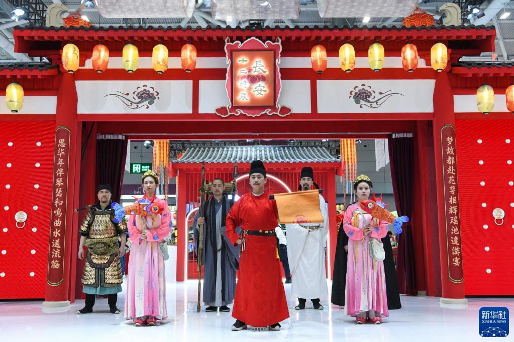 6月9日,在文博會(huì )“文旅消費館·一帶一路國際館”陜西展臺,身著(zhù)古裝的工作人員歡迎觀(guān)眾的到來(lái)。