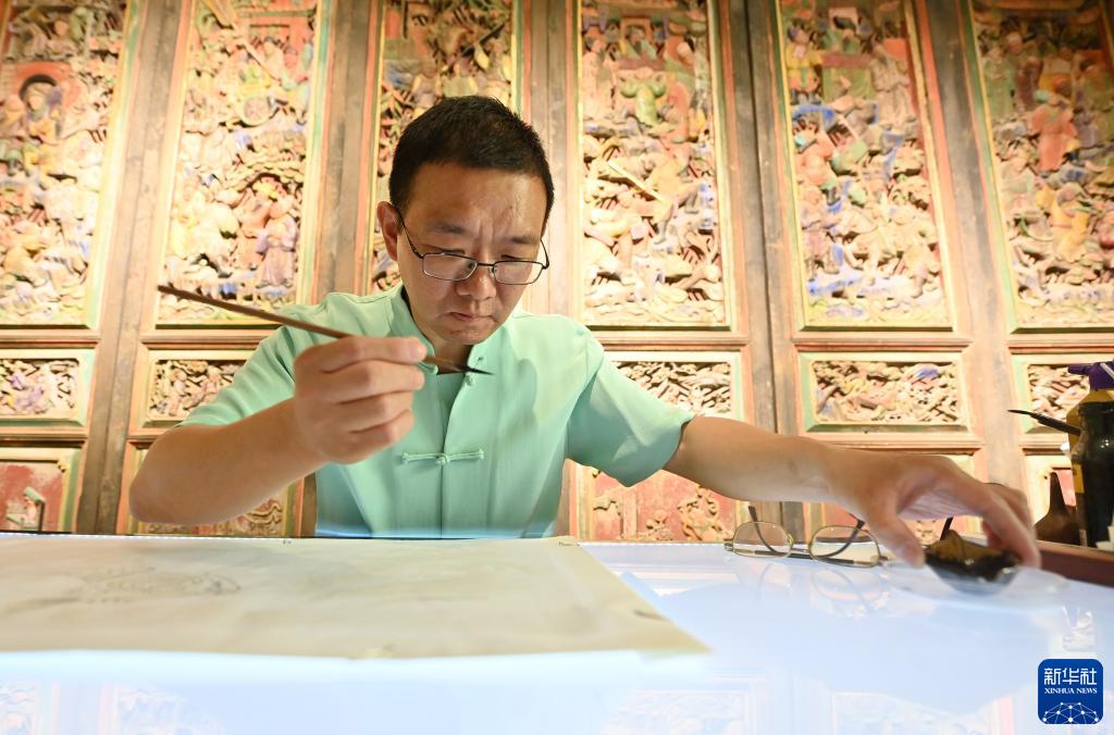 霍樹(shù)林在天津市西青區的楊柳青霍氏古一張畫(huà)店準備進(jìn)行勾線(xiàn)(6月6日攝)。