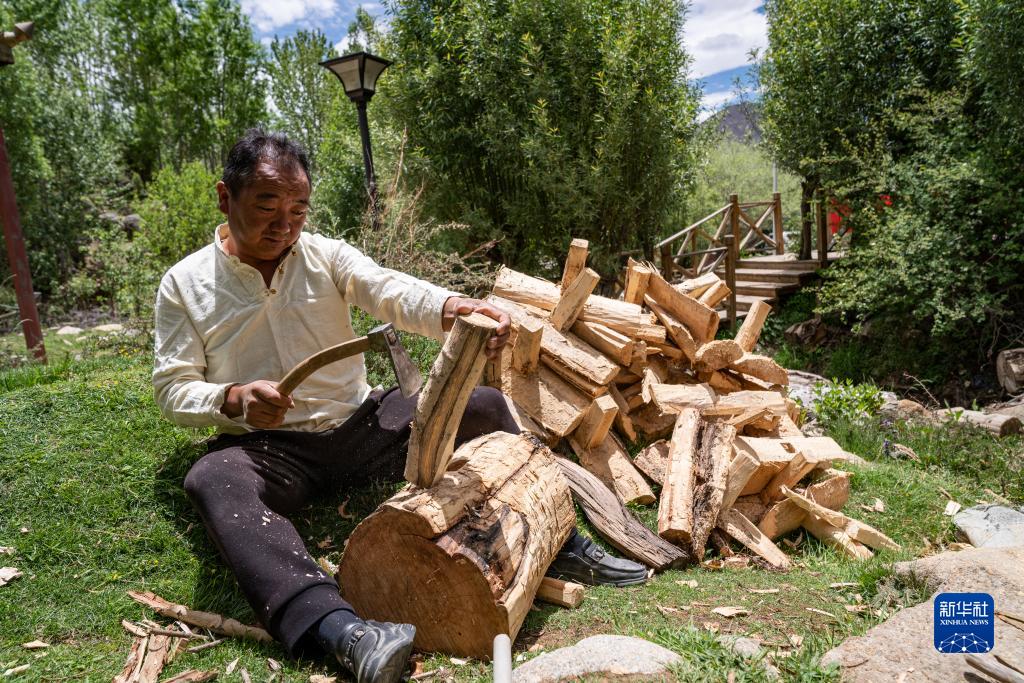 在西藏尼木縣吞巴鎮吞達村,次仁多吉在砍削柏木,為藏香制作準備原料(6月9日攝)。