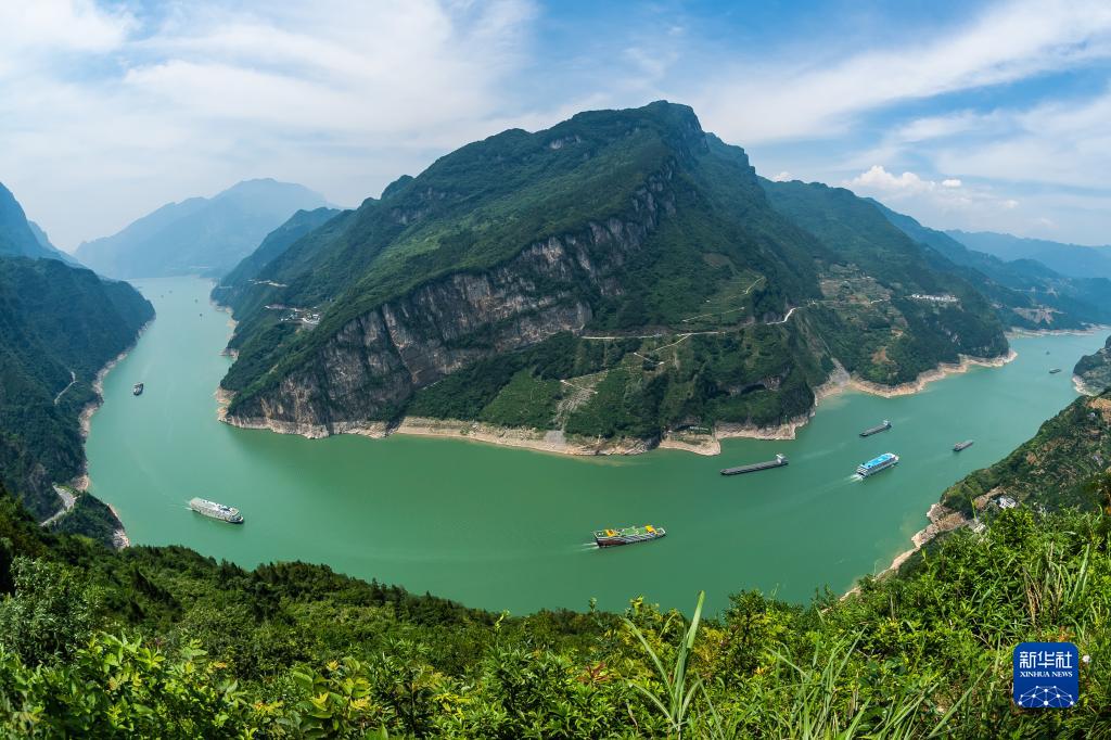 6月10日,船舶行駛在三峽大壩上游湖北省宜昌市秭歸縣水域。三峽水庫水位下降后的消落帶清晰可見(jiàn)。