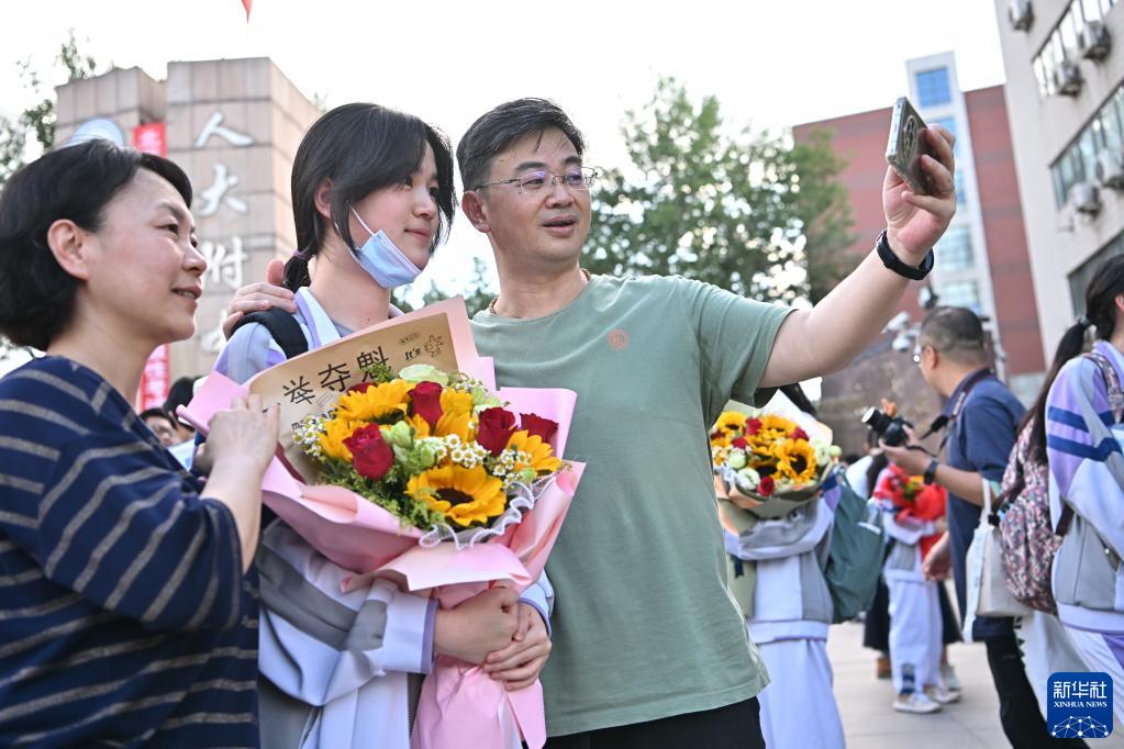 6月10日,在北京人大附中考點(diǎn),考生與父母自拍留念。