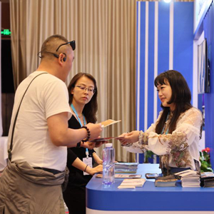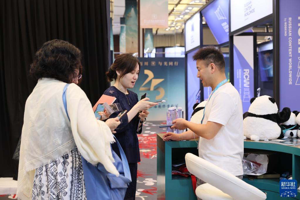 6月10日,展商在電影市場(chǎng)與咨詢(xún)者交換聯(lián)系方式。