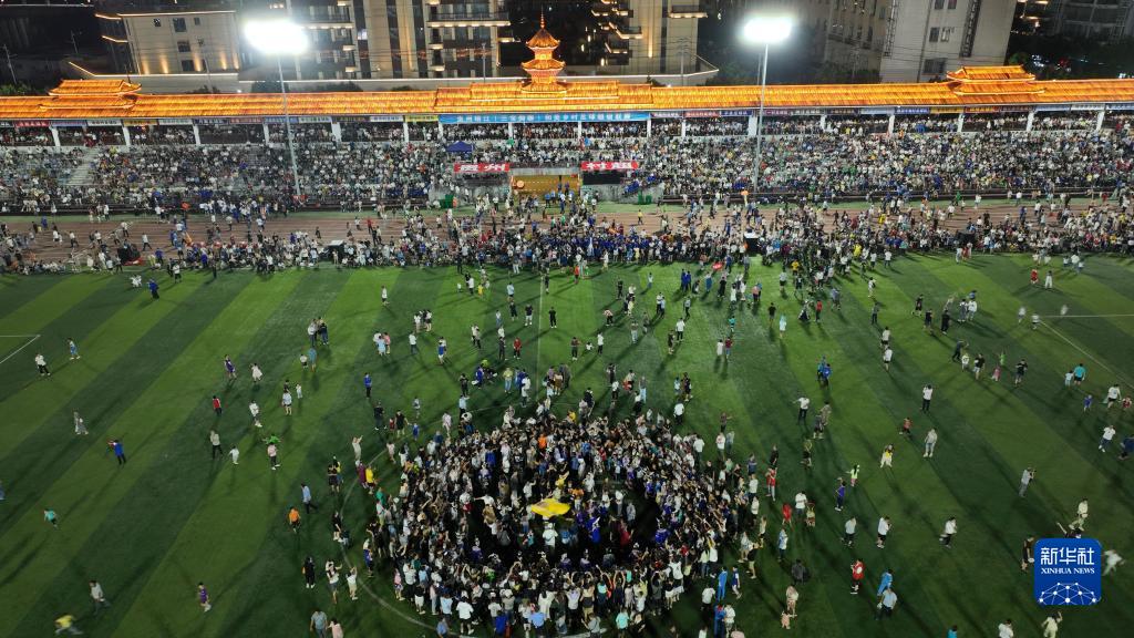 6月9日拍攝的貴州“村超”足球比賽休息期間的民族舞蹈表演(無(wú)人機照片)。