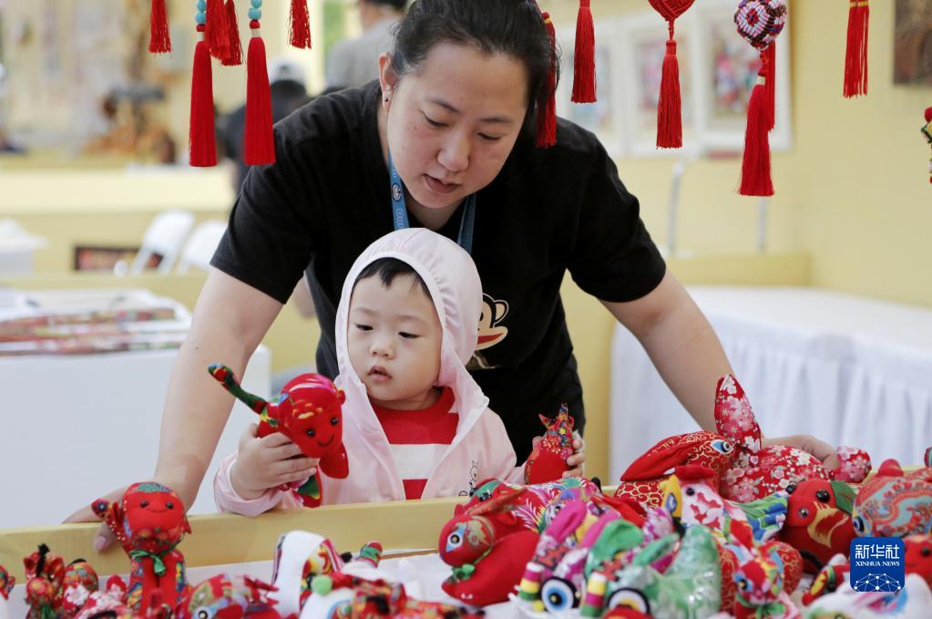 6月10日,在哈爾濱市索菲亞廣場(chǎng)非遺工坊展,市民在了解傳統手工布藝展品。