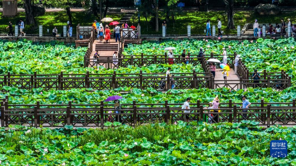 盛夏時(shí)節,廣西南寧市南湖之濱的荷花漸次綻放,吸引游客前來(lái)觀(guān)賞。