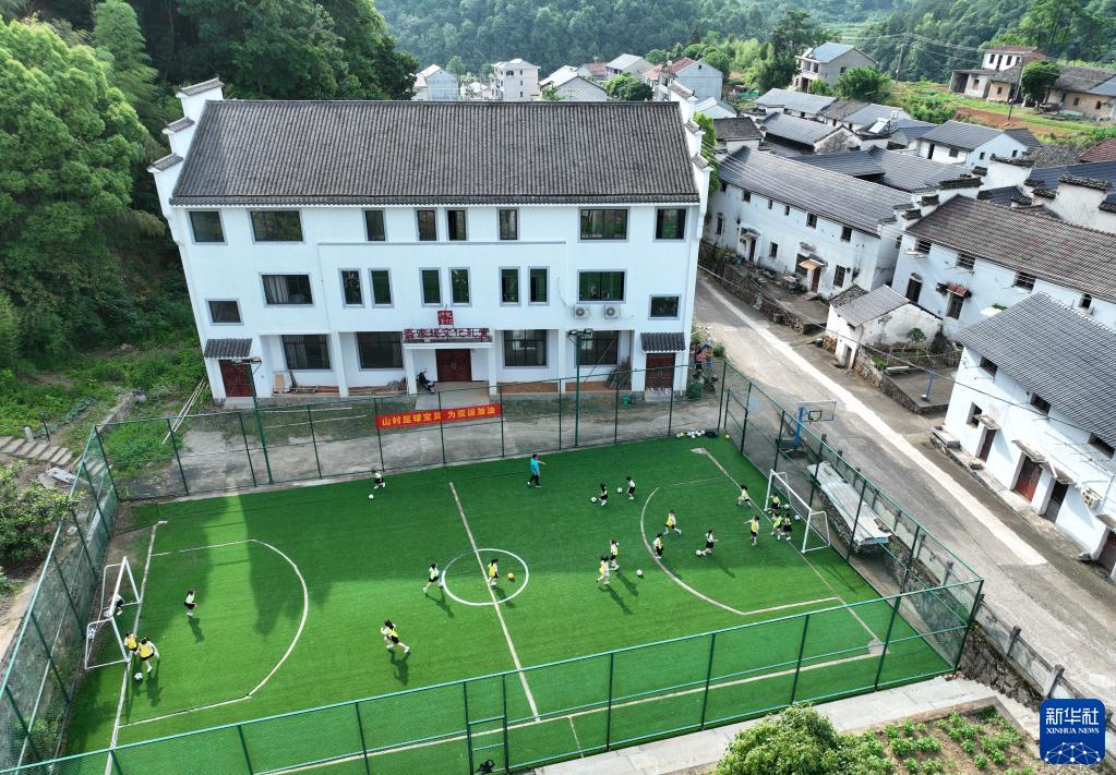 小學(xué)生在浙江諸暨市浬浦鎮一座鄉賢捐資興建的足球場(chǎng)內踢球(5月25日攝)。
