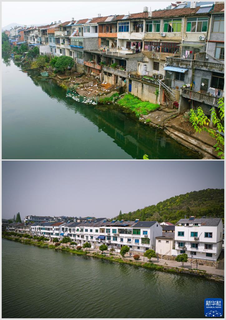 拼版照片:上圖為浙江諸暨市暨南街道街亭村開(kāi)化江畔的民居(2013年11月13日攝);下圖為村容村貌提升后暨南街道街亭村開(kāi)化江畔民居新貌(無(wú)人機照片,2023年4月12日攝)。