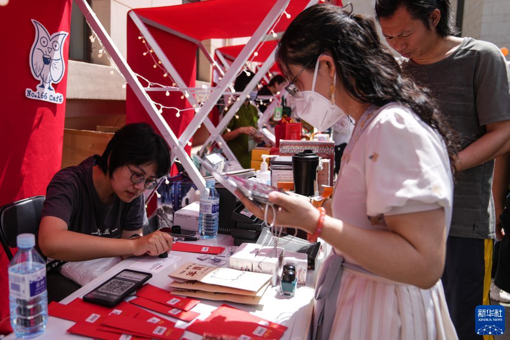 6月11日,觀(guān)眾在文創(chuàng )市集上集章打卡。