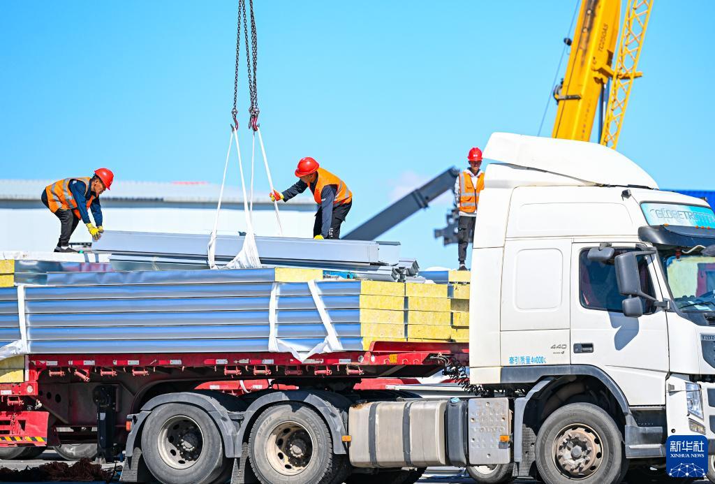 6月11日,工人在二連浩特口岸旁的進(jìn)出口物流園區中裝載準備出口的貨物。