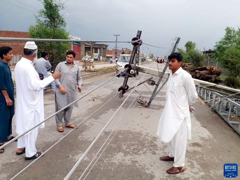 6月10日,在巴基斯坦本努地區,人們查看被暴雨損毀的電線(xiàn)桿(手機照片)。