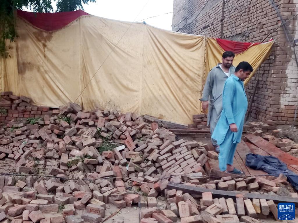 6月10日,在巴基斯坦本努地區,人們站在房屋倒塌的墻壁旁(手機照片)。