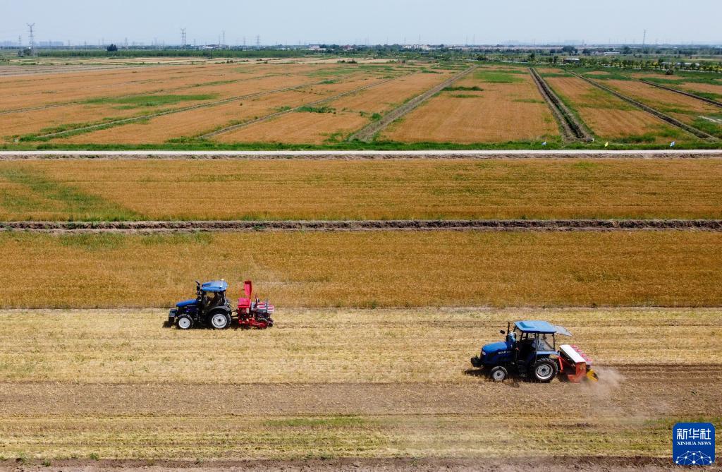 6月11日,在天津市靜海區蔡公莊鎮,農機在收割完小麥的土地上進(jìn)行玉米播種(無(wú)人機照片)。