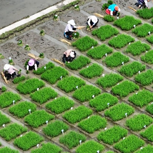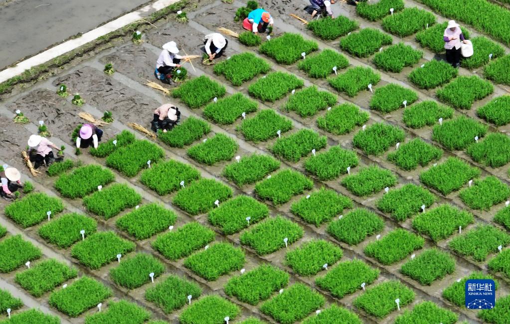 6月11日,在江蘇里下河地區農科所(揚州市農科院),農民在試驗田里起秧苗(無(wú)人機照片)。