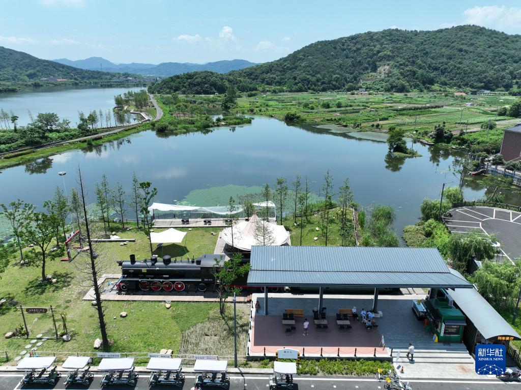 人們在浙江紹興上虞區驛亭鎮白馬湖畔的“列車(chē)營(yíng)地”休閑、喝咖啡(無(wú)人機照片,6月9日攝)。