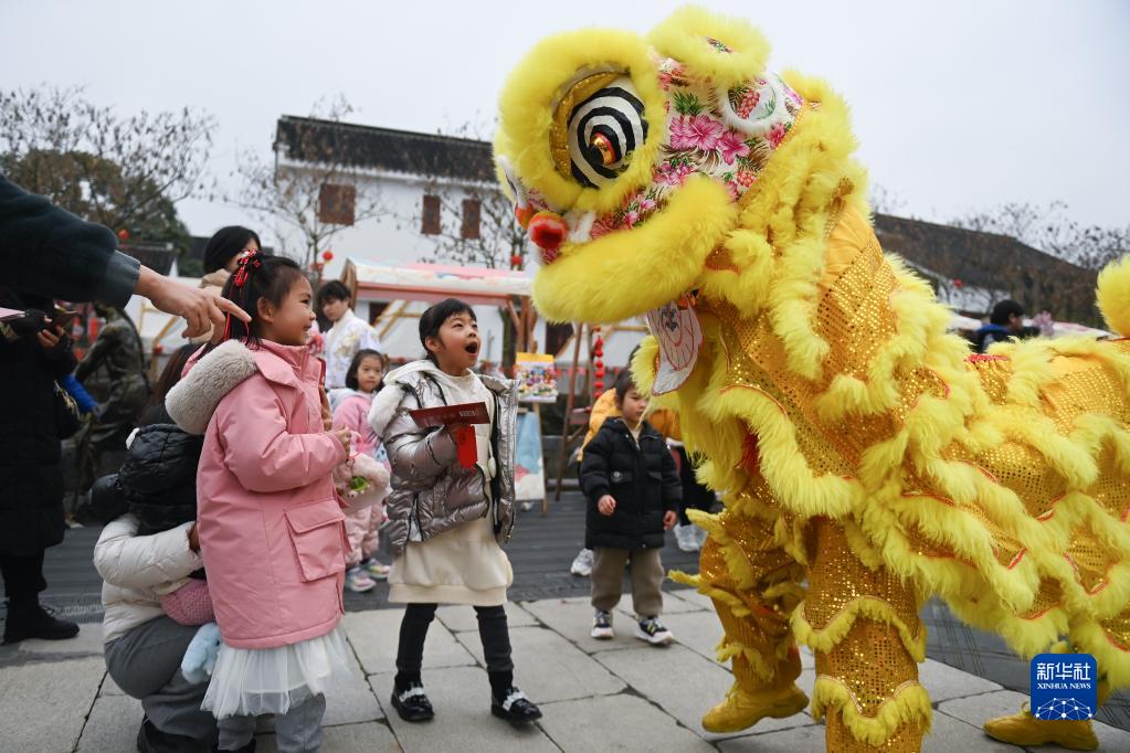 游客在浙江湖州吳興區八里店鎮潞村觀(guān)看舞獅表演(2月5日攝)。