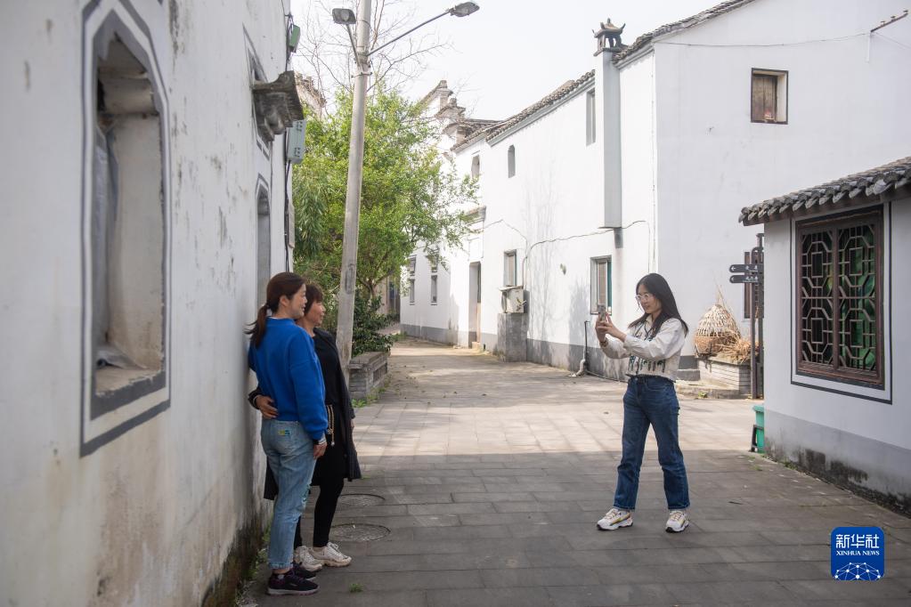 游客在浙江諸暨暨南街道周村古村落內游玩拍照(4月12日攝)。暨南街道周村是歷史文化村落,擁有豐富的古建筑資源。