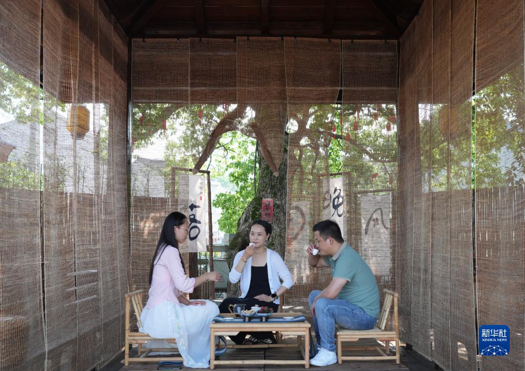 人們在浙江紹興上虞區驛亭鎮白馬湖畔的茶社喝茶(6月9日攝)。當地對公園提檔升級,引進(jìn)“春暉茶社”,促進(jìn)集體經(jīng)濟增收。