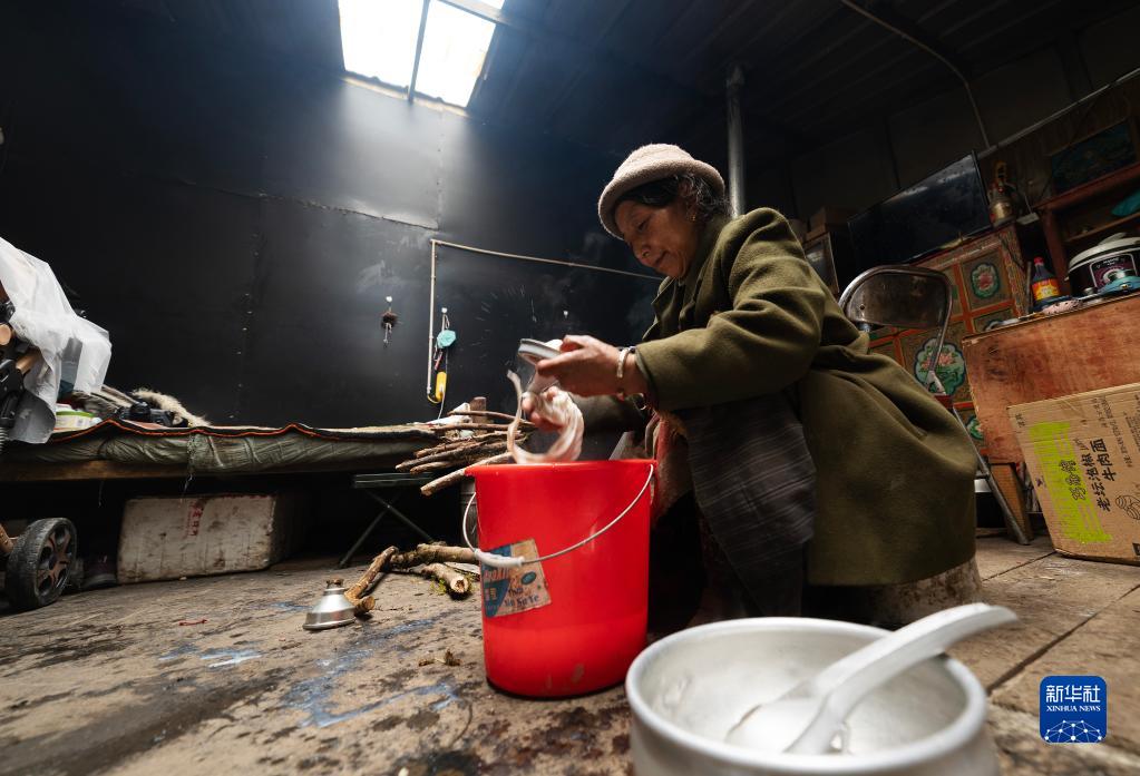 6月10日,卓嘎在牧場(chǎng)小屋中清洗制作酥油的工具。