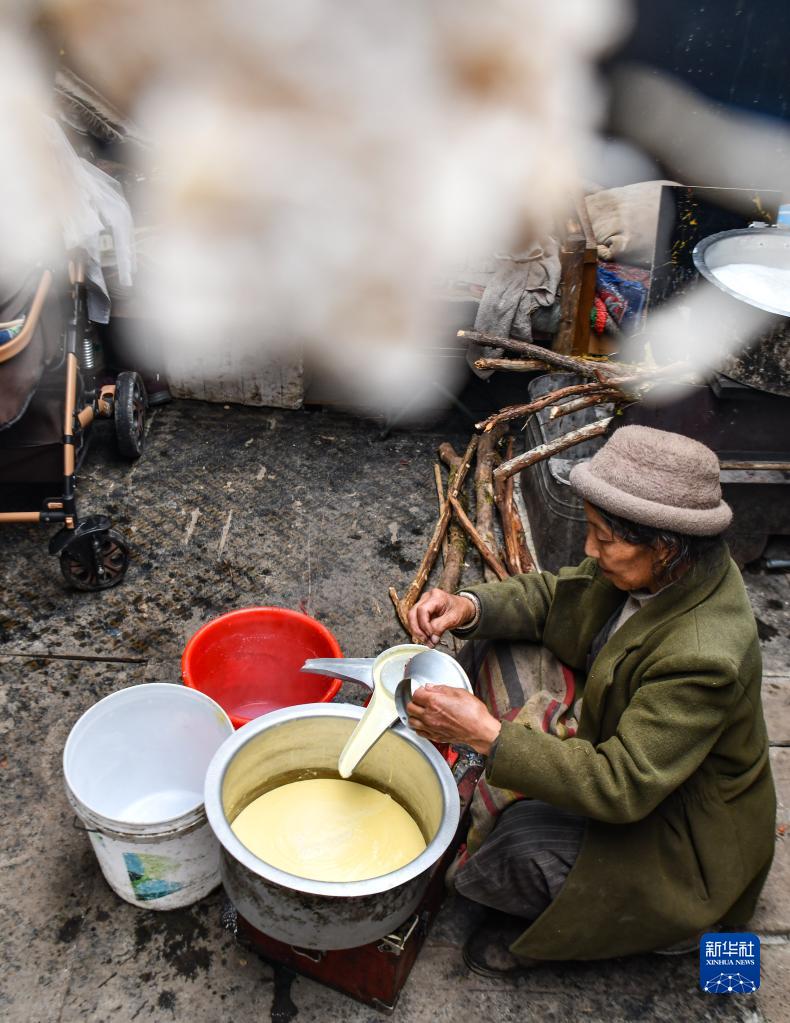 卓嘎在牧場(chǎng)的小屋里制作酥油(6月10日攝)。
