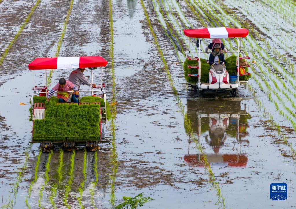 6月12日,江蘇省泰州市海陵區紅旗街道農民駕駛插秧機進(jìn)行插秧作業(yè)(無(wú)人機照片)。新華社發(fā)(湯德宏 攝)