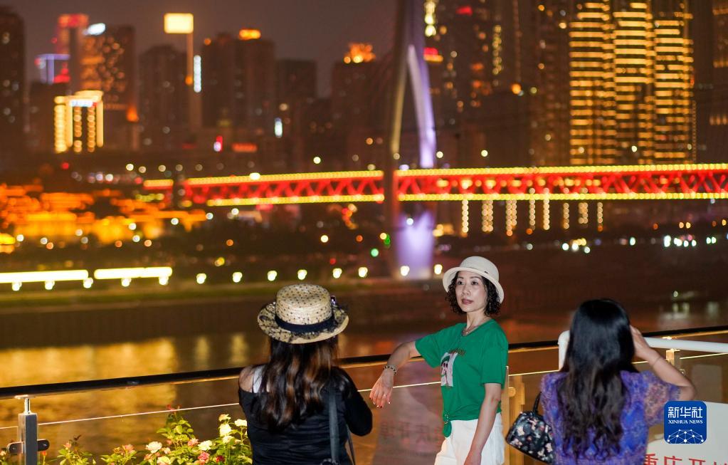 6月9日,重慶開(kāi)埠遺址公園的觀(guān)景平臺上,游客們在打卡拍照。