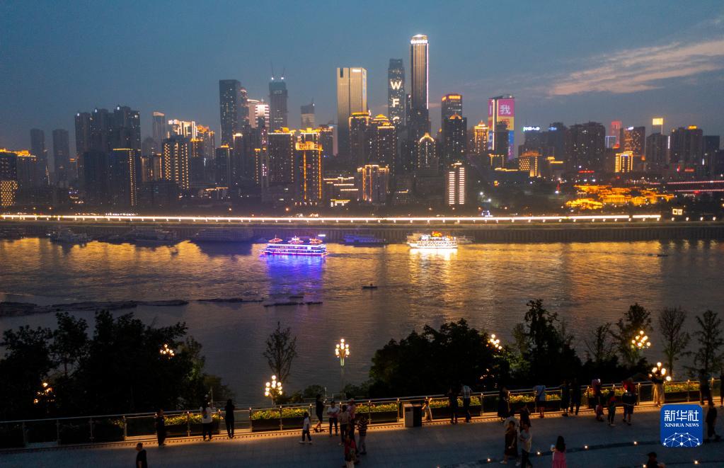 6月9日,重慶開(kāi)埠遺址公園的觀(guān)景平臺上,游客們在欣賞重慶夜景(無(wú)人機照片)。