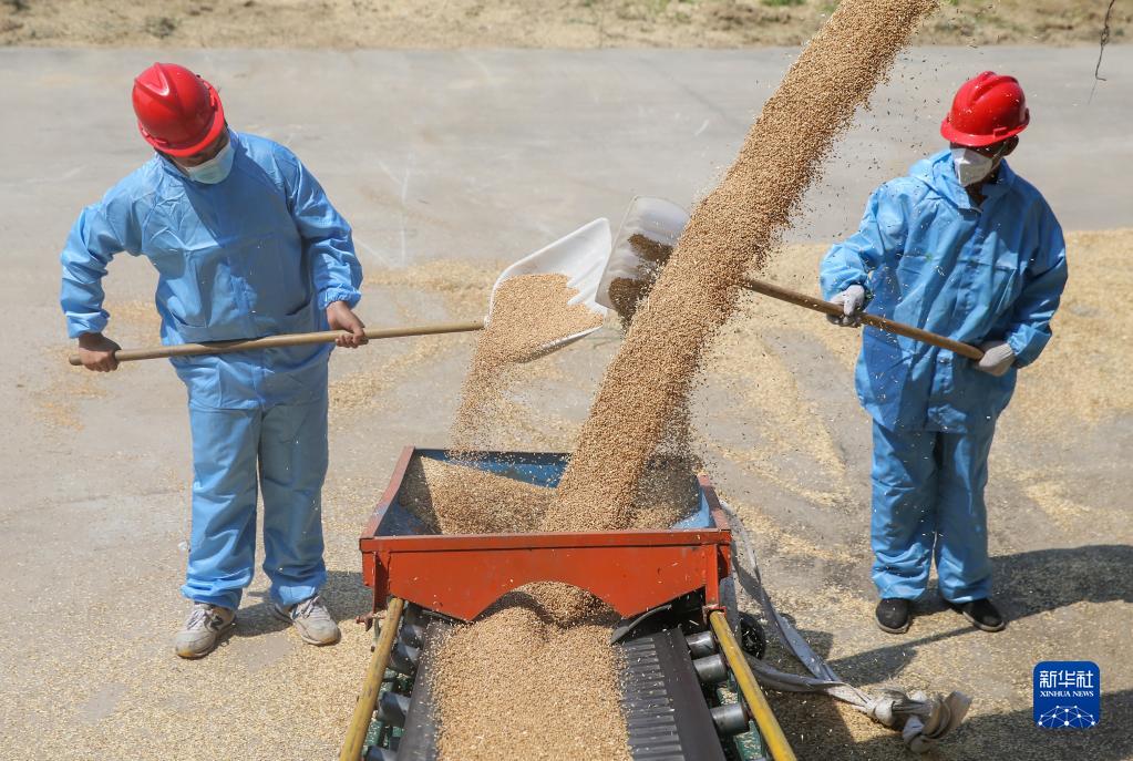 6月13日,在江蘇連云港市青口鹽場(chǎng)倉儲中心,工人用傳輸機傳送烘干后的小麥入庫。