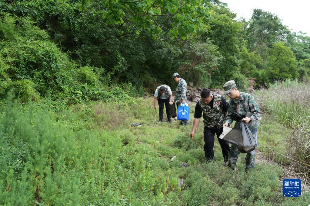6月13日,海島護鳥(niǎo)隊的成員在寧海灣一座島上撿拾垃圾。