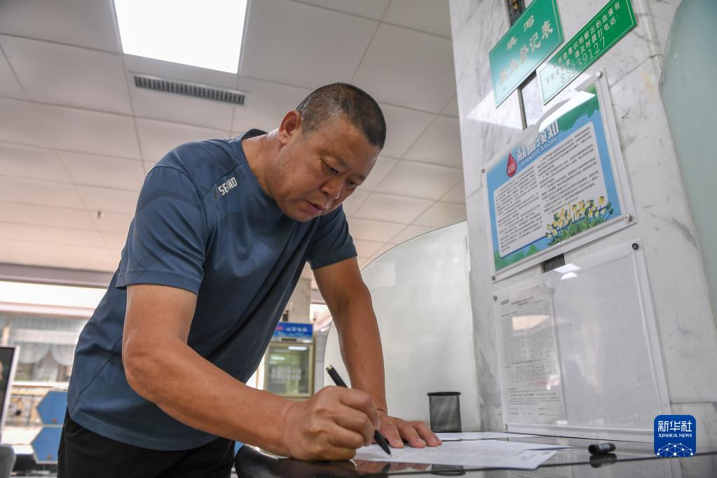 6月13日,在長(cháng)春市中心血站,RH陰性血無(wú)償獻血志愿者王文東在獻血前填寫(xiě)個(gè)人信息。