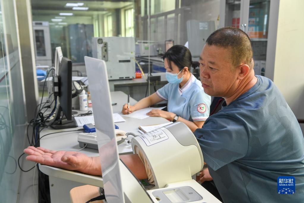 6月13日,在長(cháng)春市中心血站,RH陰性血無(wú)償獻血志愿者王文東(右)在獻血前量血壓。