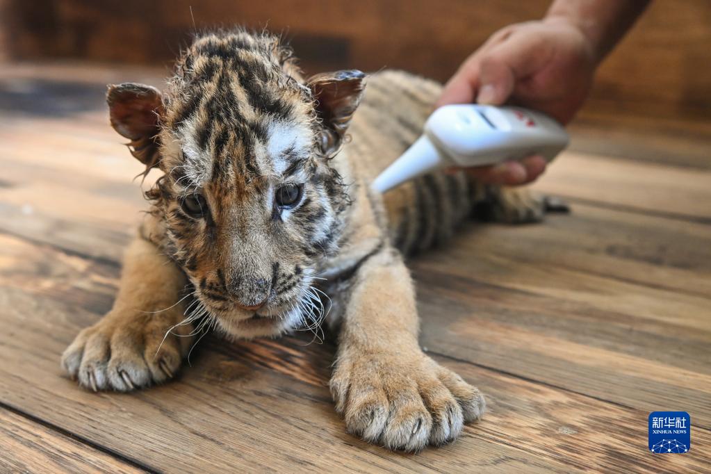 6月13日,在黑龍江東北虎林園的虎舍中,飼養員給東北虎幼崽測量體溫。