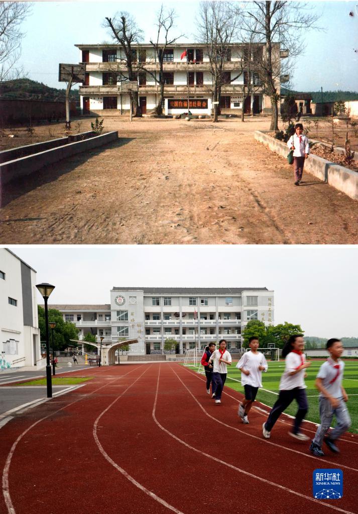 拼版照片:這是在鄣吳村同一地點(diǎn)拍攝的原安吉縣鄣吳鄉中心小學(xué)(上圖,王光法1987年攝)和安吉縣昌碩小學(xué)(下圖,新華社記者韓傳號2023年6月13日攝)。
