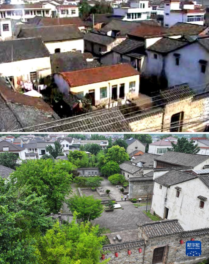 拼版照片:這是安吉縣鄣吳鎮鄣吳村吳昌碩故居(上圖,視頻截圖,王光法2001年攝;下圖,無(wú)人機照片,夏鵬飛2023年6月13日攝)。