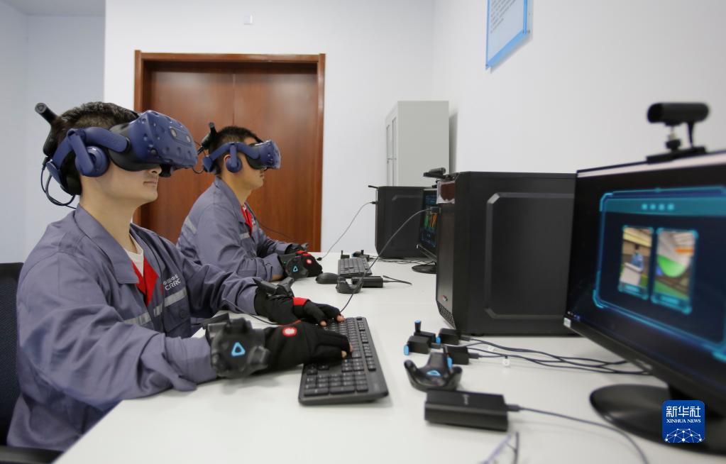 在江蘇射陽(yáng)港零碳產(chǎn)業(yè)園,工作人員在VR培訓室進(jìn)行模擬測試(6月13日攝)。