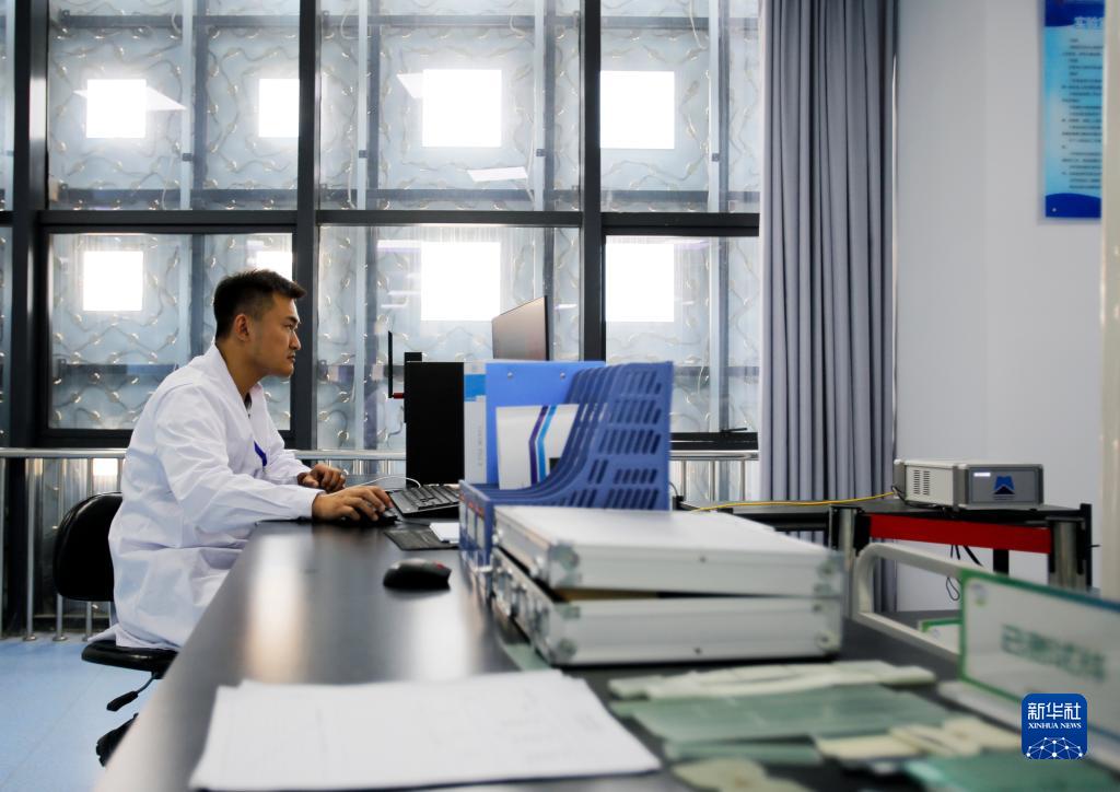 6月13日,在江蘇射陽(yáng)港零碳產(chǎn)業(yè)園,工作人員在海上風(fēng)電復合材料檢測中心收集、分析測試數據。